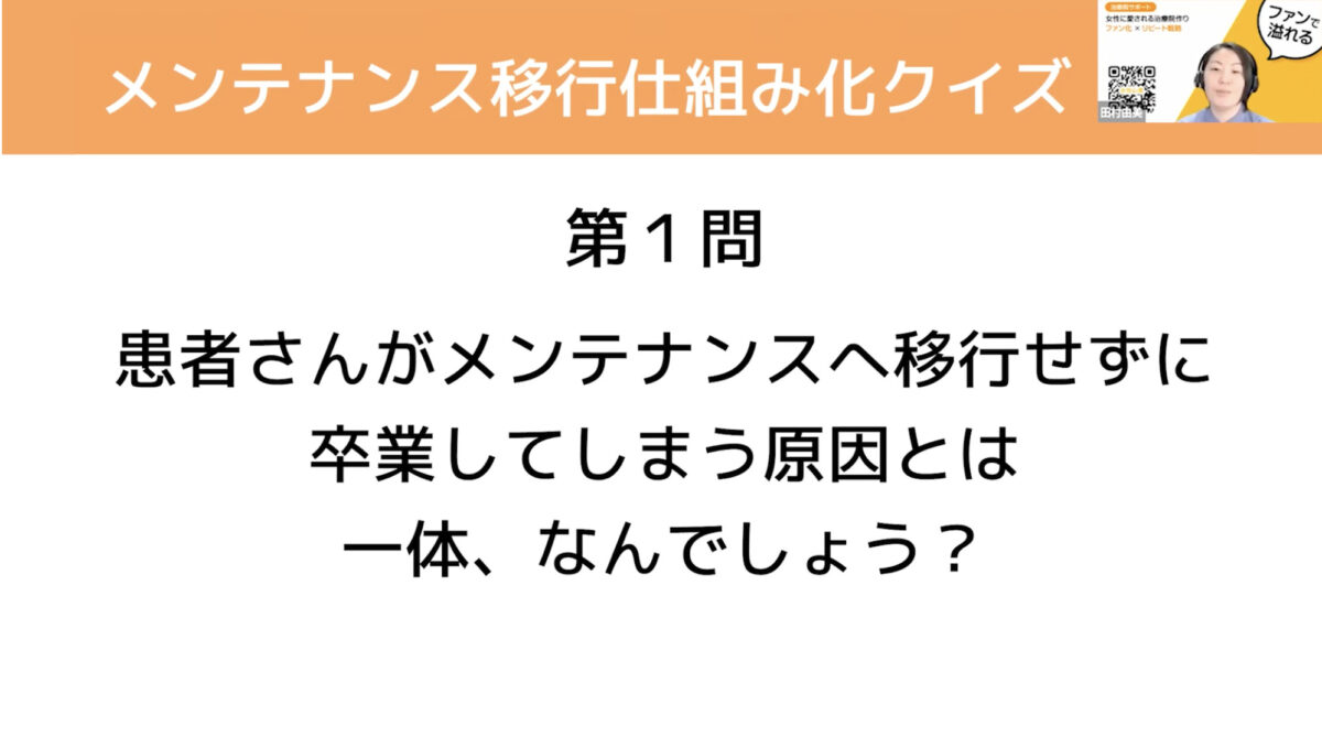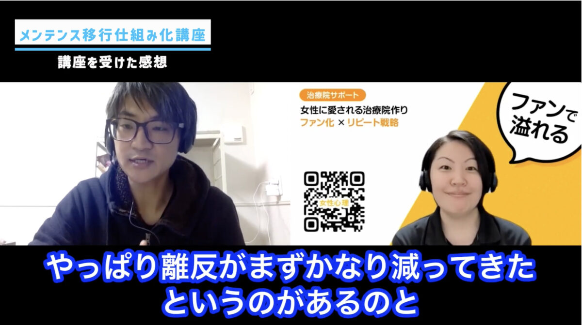 メンテナンス移行仕組み化講座に参加して約三カ月経過しましたが、現状として離脱率が低下してリピート率が安定して既存の患者さんで予約枠がほとんど埋まっている状態です。