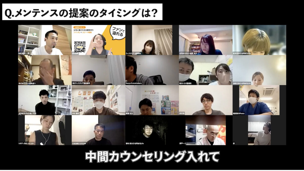 - メンテナンスの仕組みについてとても勉強になりました。今までメンテナンスに移行できていなかった方がなぜできないのか、自分の中で視覚化できていないことが原因だと気づくことができました。それに加えて田村先生の話し方や話の聞き方も勉強になりました!
