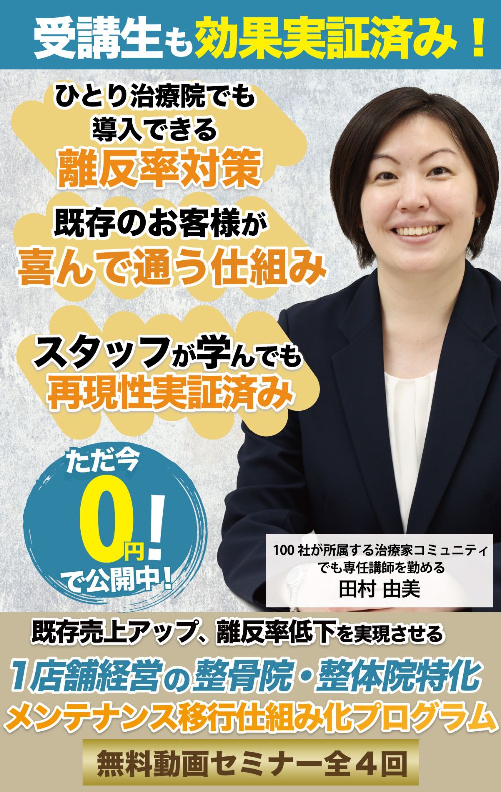 - 次の日からすぐに行動できるようなとても分かりやすいセミナーでした。また、田村先生のお話の仕方や、声のトーン、表情、話の流れなどメンテナンスだけではなく、様々なことが勉強になりました!女性施術家としてとても尊敬しております。田村先生のように、多くの患者様を幸せにしファンが増えるようにがんばります!今後ともご指導、よろしくお願いいたします!とても素敵なご講義ありがとうございました。